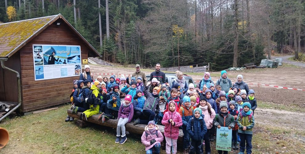 Am 7. November 2025 machten sich die Schülerinnen und Schüler der Klassen 1a, 1b und 2 mit ihren Klassenlehrerinnen und engagierten Begleitpersonen auf den Weg zur Schanze in Bad Elster, um Weißtannen für den 15. Kinderwald zu pflanzen. Revierförster Christoph Schultis und seine Mitarbeiter erwarteten uns schon an der Schanze. Sie stellten die Baumpflanzen bereit und leiteten die Pflanzaktion. Mit viel Freude und Einsatz halfen die Kinder beim Einsetzen der Pflanzen und beim Auffüllen der Erde.