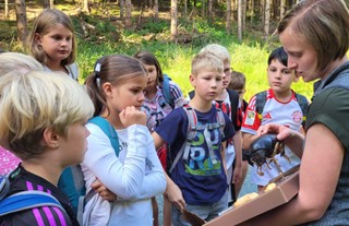 Gleich in der allerersten Schulwoche brach die Klasse 4b mit Frau Paesold und Frau Undeutsch auf in den Wald. Alle freuten sich sehr auf diesen Tag, denn spätestens nach dem Besuch der Waldjugendspiele in Mühlleithen im Juni diesen Jahres war allen Kindern klar, dass der Wald ein richtig spannendes Thema ist. Luisa, die Waldpädagogin, hat uns nicht nur den Wald als Lebensraum umfassend vorgestellt, sie hat – zusammen mit den Kindern – über die Gefahren gesprochen, denen der Wald ausgesetzt ist. Danke für diesen tollen Tag an Luisa und den Sachsenforst!